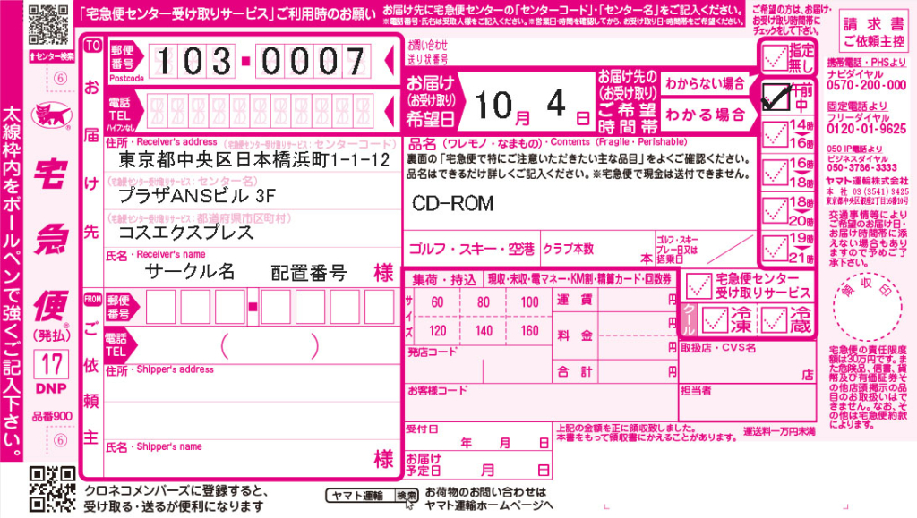 ・伝票のお届け先氏名の欄に必ず「サークル名」と「配置番号」をご記入下さい。